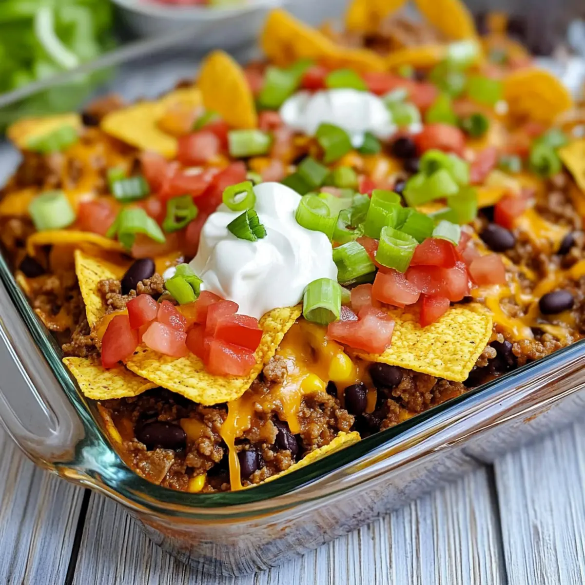 In a large baking dish, start by creating a layer of Fritos corn chips at the bottom, spreading them evenly to form a crunchy base. Next, spoon half of the beef mixture over the chips, followed by a layer of shredded cheese. This layering will create delightful textures and flavors in each bite.