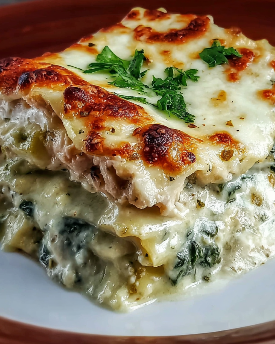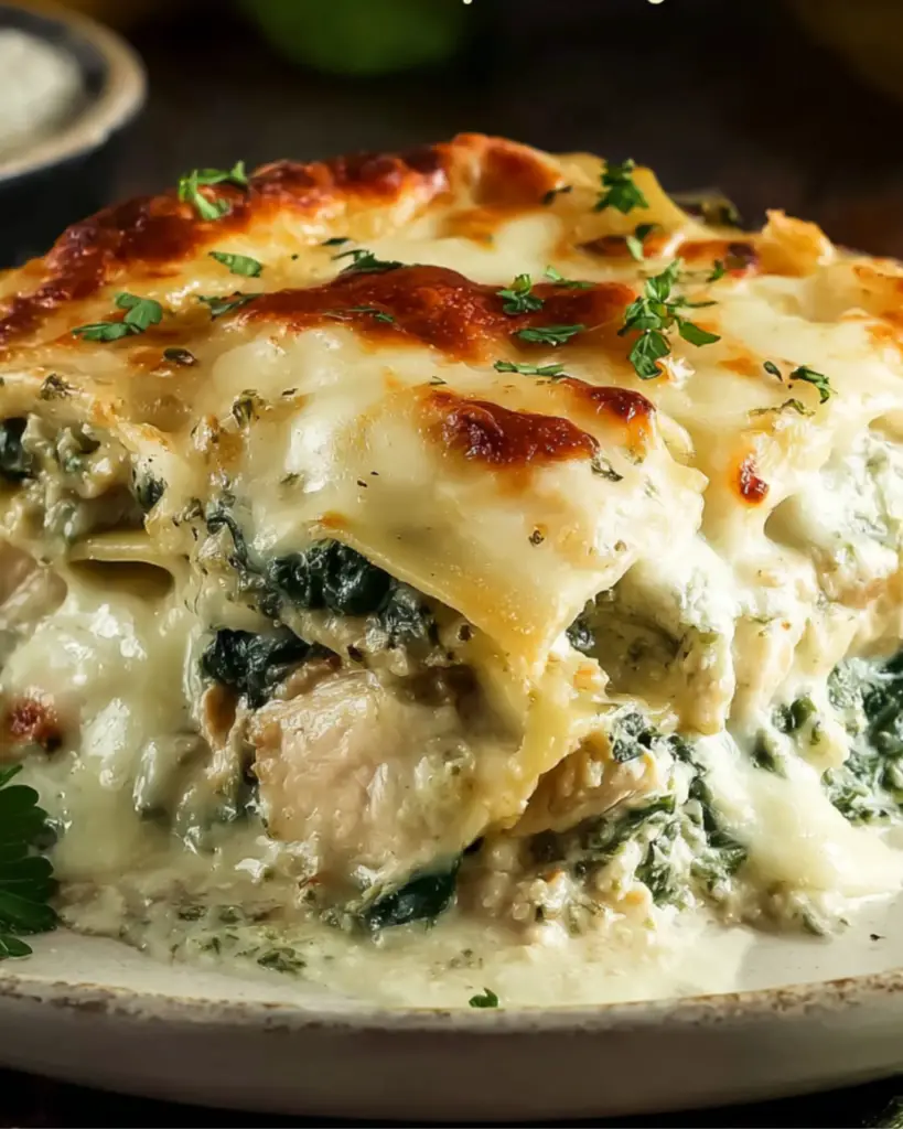 A creamy and delicious White Chicken Spinach Lasagna that combines tender chicken, fresh spinach, and rich cheeses for a comforting meal.